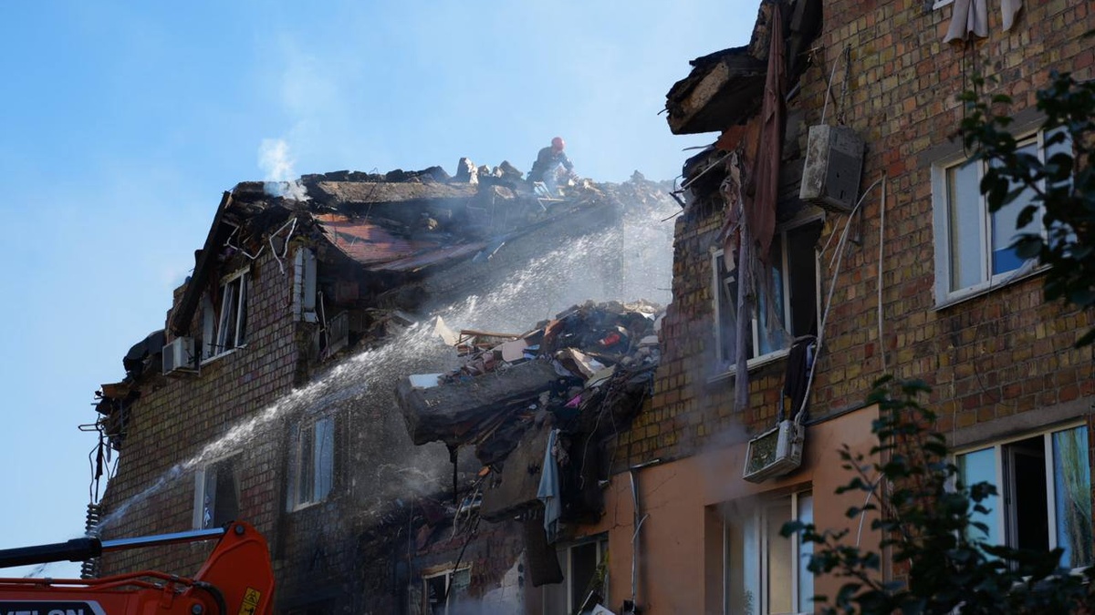 На місці ворожого удару по п'ятиповерхівці в Дарницькому районі Києва тривають аварійно-відновлювальні роботи, аби жителі вцілілих квартир будинку