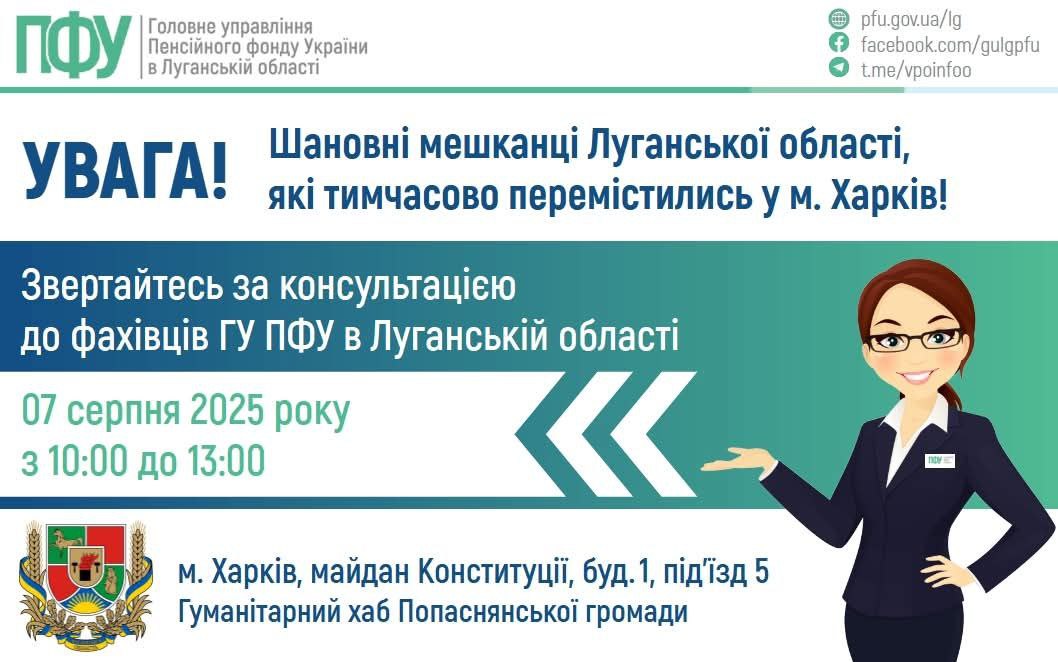 «7 августа в гуманитарном центре Попаснянской общины состоится прием переселенцев специалистом ГУ ПФУ в Луганской области», - сообщила Луганская ОВА