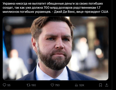 Фейк: Джей Ді Венс заявив, що Україна ніколи не виплатить компенсації родинам усіх загиблих військових