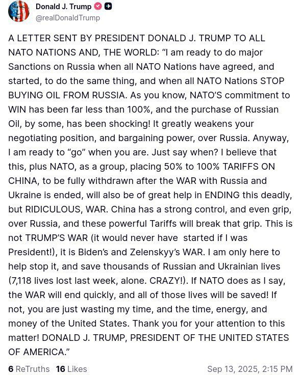 Президент США Дональд Трамп заявил, что готов ввести "значительные санкции" против России, но только при условии, что все страны НАТО присоединятся к