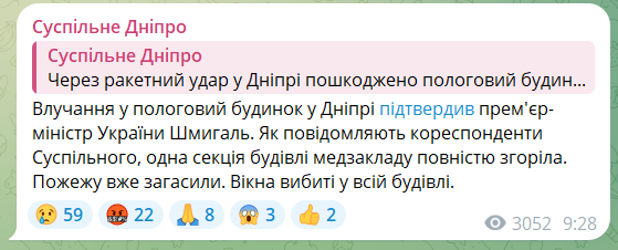 Утром в пятницу, 29 декабря, во время массированного удара по Днепру зафиксировано попадание в роддом. Часть здания полностью разрушена. К счастью,