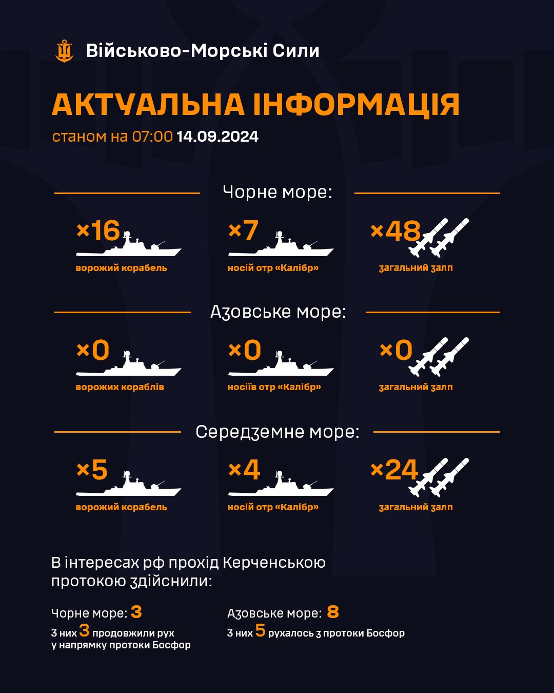 Утром 14 сентября в Черном море зафиксировано 16 российских кораблей, среди которых семь носителей ракет "Калибр". Украинцы предупреждают о возможных