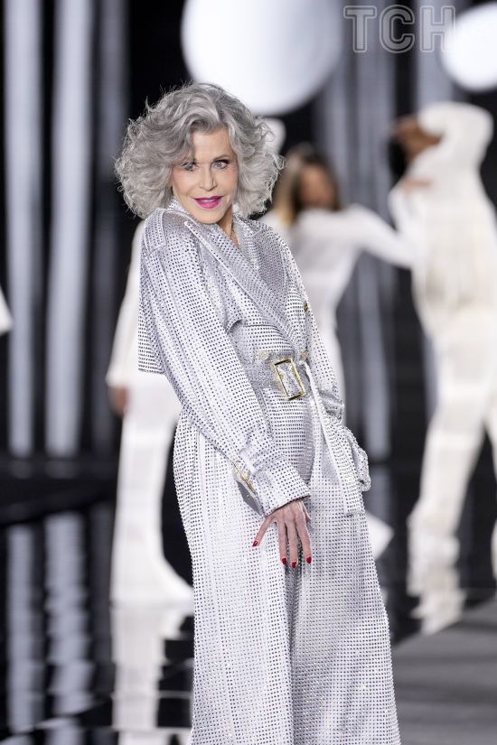 В серебряном тренче со стразами: 86-летняя Джейн Фонда эффектно продефилировала на Неделе моды в Париже