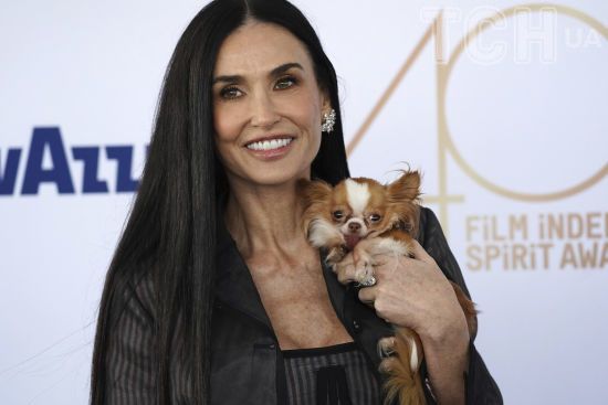 В полосатом наряде с прозрачной юбкой: Деми Мур с крошечным песиком на руках появилась на премии