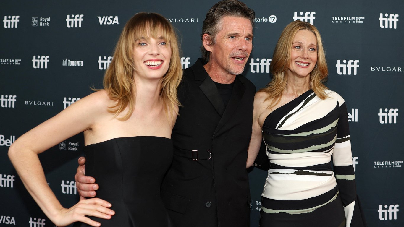 Актер Итан Хоук, его дочь Майя Хоук и актриса Лаура Линни были замечены на премьере своего фильма "Дикая кошка" в Торонто. Трио позировало для