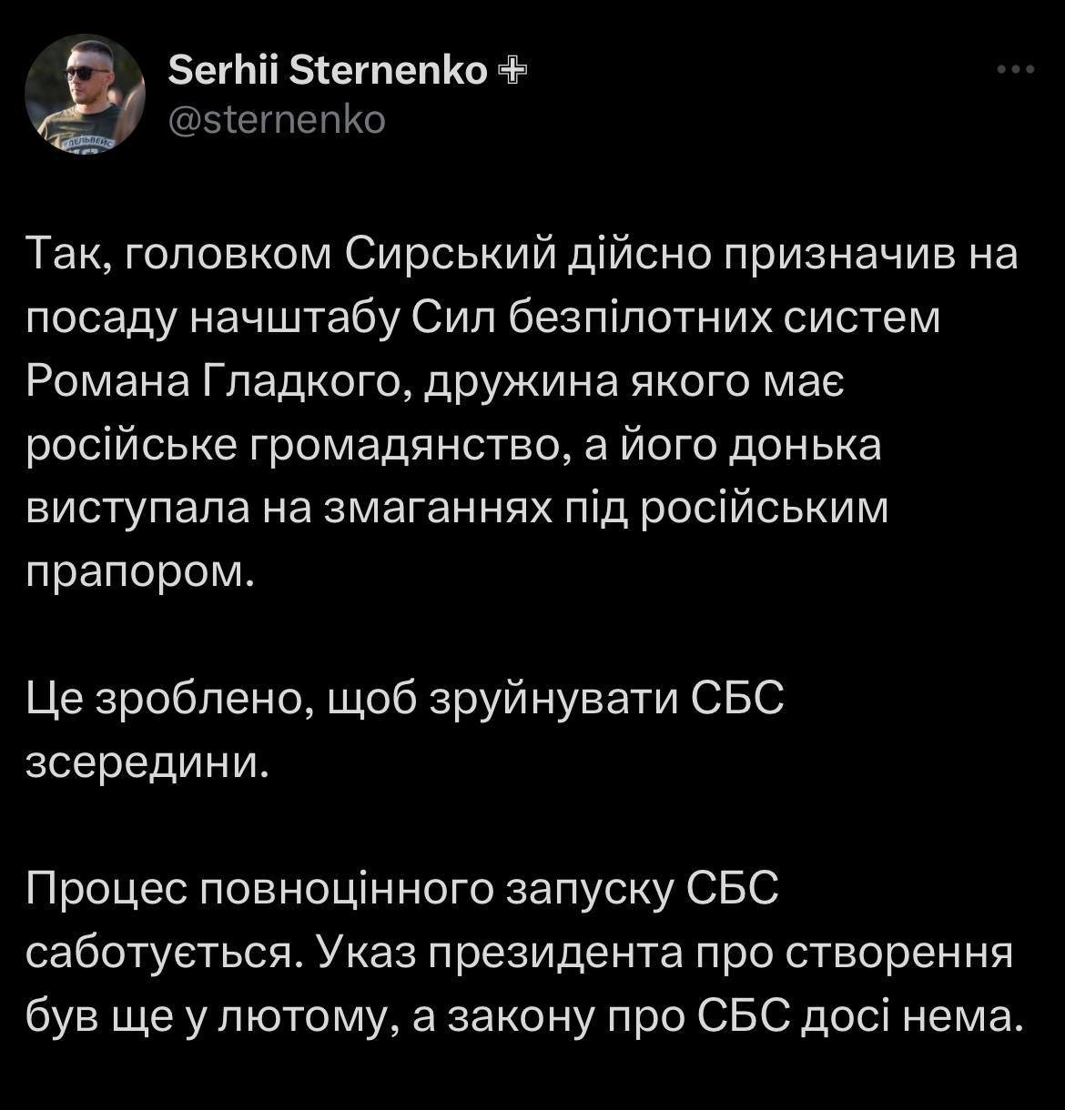 Во вновь Силах беспилотных систем ВСУ возник скандал из-за назначения на должность начальником штаба командования Романа Гладкого, о чем сообщил