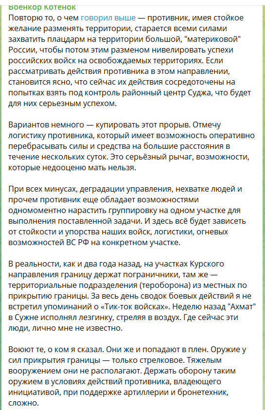 Пропаганда в РФ недовольна действиями «кадыровцев», которые допустили прорыв украинских сил через границу РФ в Курской области. Военкоры и близкие к