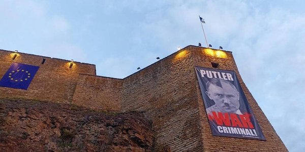 В пятницу, 9 мая, в Эстонии Нарвский музей, который находится на границе с РФ, вывесил большой плакат, отождествляющий российского диктатора