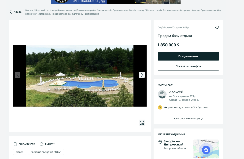 На платформі OLX з’явилося оголошення про продаж бази відпочинку «Оріяна», розташованої в селі Канівському за 20 кілометрів від Запоріжжя. Об’єкт